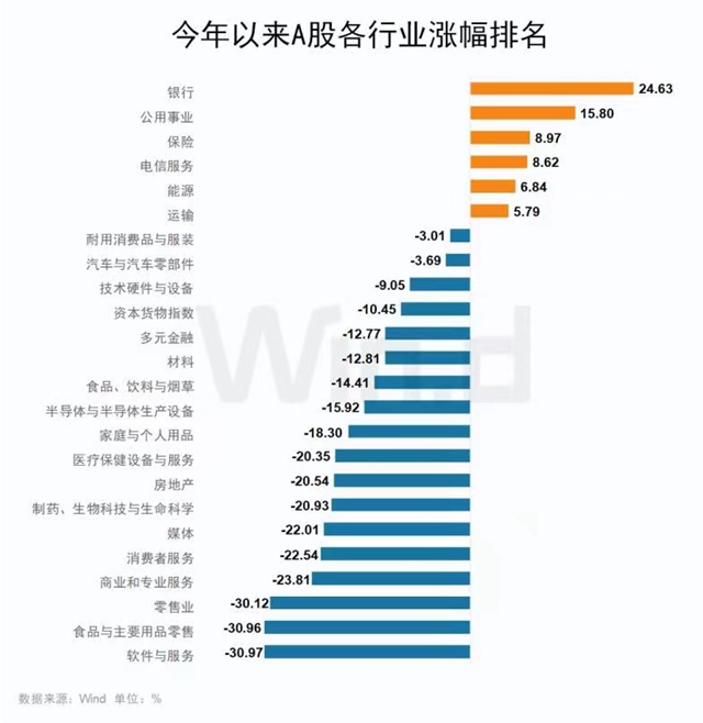 纵观今年以来,A股银行板块在24个Wind二级行业中领跑,且以接近25%的涨幅遥遥领先。其中,只有3家上市银行年内股价下跌。最近,银行股迎来密集分红期,也成为行情助推器。