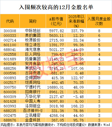 证券时报·数据宝统计,截至目前,共有197只股票入围券商12月金股名单,其中41股入围2次以上。从入围频次来看,数据宝统计,入围频次最高的是中际旭创,共8次入围月度金股名单。其次是美的集团、牧原股份、恒立液压、海光信息、巨人网络、拓普集团等。